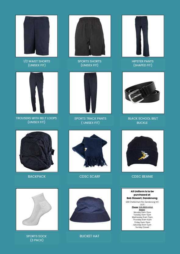 To apply for uniform and/or uniform vouchers via State Schools Relief simply phone the front office on 9788 9100 or email reception@cdsc.vic.edu.au
