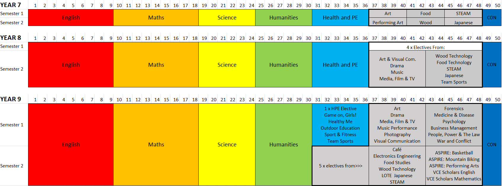 Our Curriculum Structure is organised into 6 Learning Areas: English, Mathematics, Science, Humanities, Health & Physical Education and Arts & Technology. Teachers at Carrum Downs Secondary College are allocated into a learning area based on their teaching allotment, and teachers work in teams to deliver our curriculum and plan collaboratively to ensure that we are meeting the needs for every student.