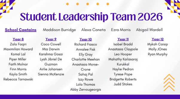 Led by our four incredible school captains, our senior leaders from Years 10-12 take on key responsibilities in the areas of Learning, Sports, Arts and Community. We also have junior leaders in Years 8 -9 who benefit from a range of experiences, working closely with our senior captains across all areas, and in their chosen areas of interest.